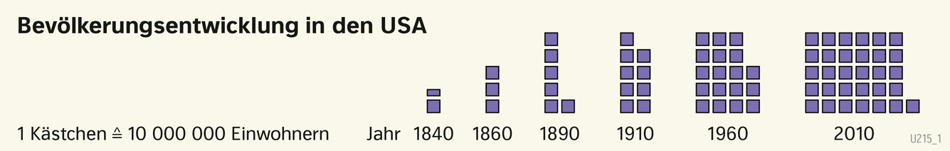 Vereinigte Staaten von Amerika (USA) - Die Erschließung des Westens - 1910 Geschichte - Die Entwicklung der USA zum Einwanderungsland 978-3-14-100453-3 | Seite 211 | Abb. 1 | Maßstab 1 : 45000000 Schlagworte Frontier Indigene räumliche Erschließung Urbevölkerung Grafiken Bild Bevölkerungsentwicklung in den USA
