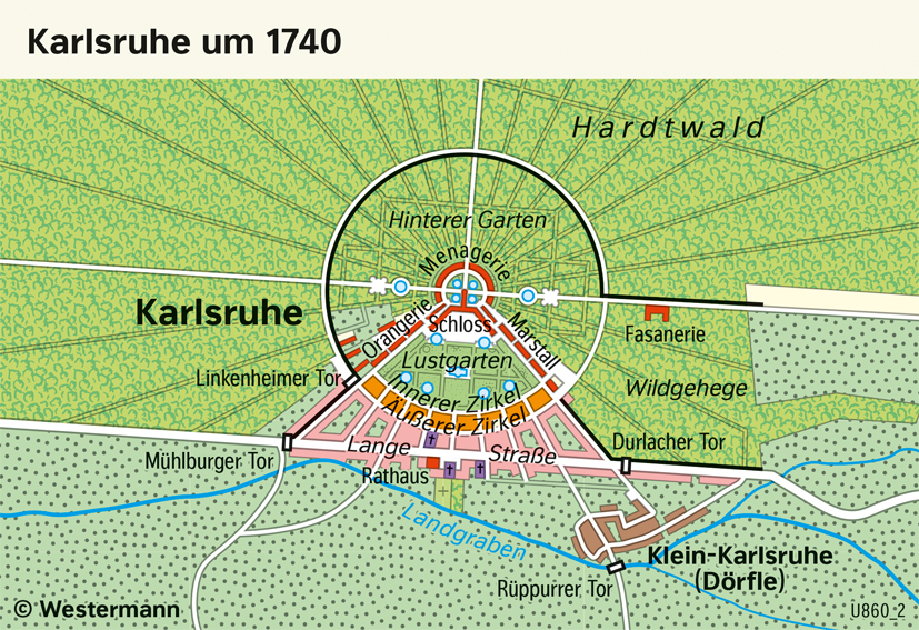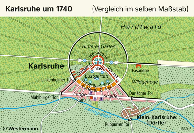 Versailles - Residenz im 18. Jahrhundert Geschichte - Vom Barock zum Napoleonischen Zeitalter 978-3-14-100371-0 | Seite 206 | Abb. 1 | Maßstab 1 : 40000 Schlagworte Absolutismus Palast Schloss Grafiken Bild Karlsruhe um 1740